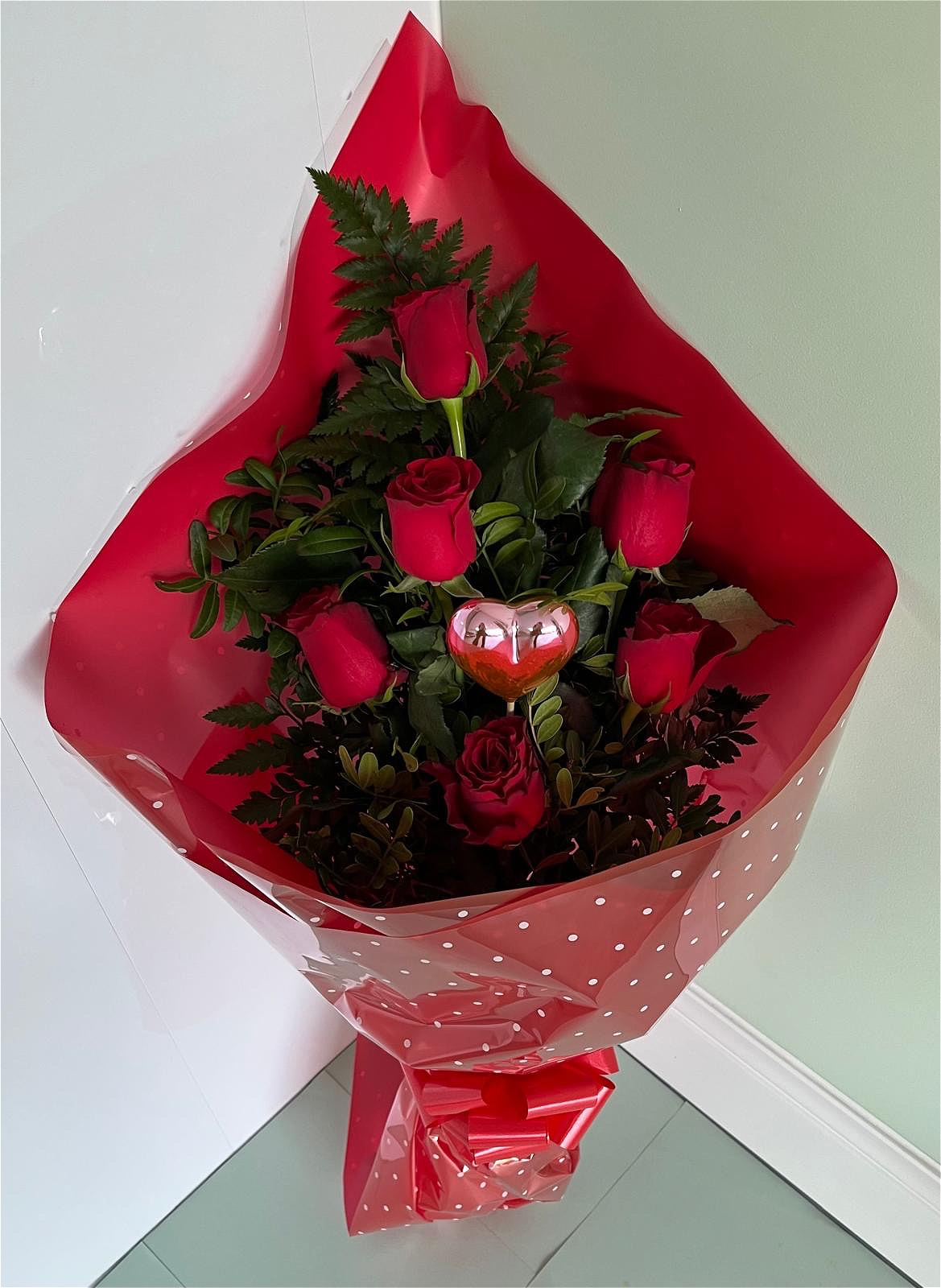 6 best quality, long stem, beautiful red roses with seasonal foliage. Hand tied, wrapped in cellophane and finished with a red ribbon bow.